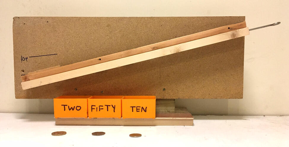 This machine is a semi -automated coin sorter for 10p, 50p and £2 coins. It is operated by moving the arm up and down to control the speed of the coin roll. For each box there is a hole sized for the particular coin . However if the speed is set for a £2 coin but a 50p is inserted, the coin will roll over its hole and go into the £2 coin instead.