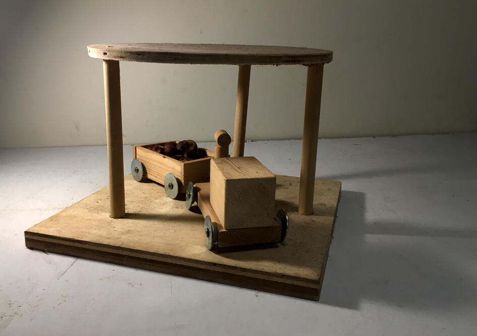 Made of wood and an old stool, this gym machine runs by each wheel fixed to one and other so when one is turned the other does as well. Covering the pedals is a thin plastic tube which rotates freely, allowing the pedal to align with the wheel.