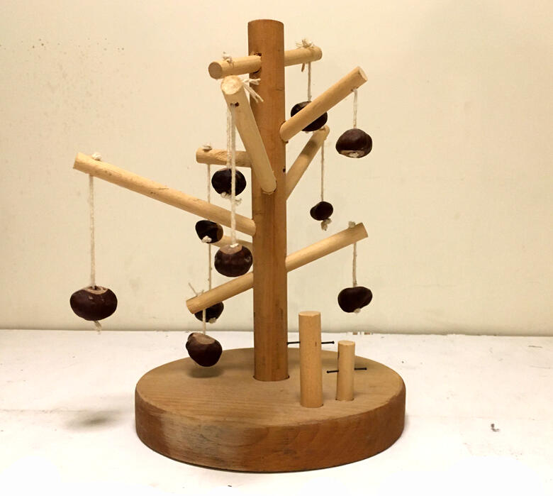 This is a conker cheese board with two people watching. I made it from wood, string, nails and conkers!