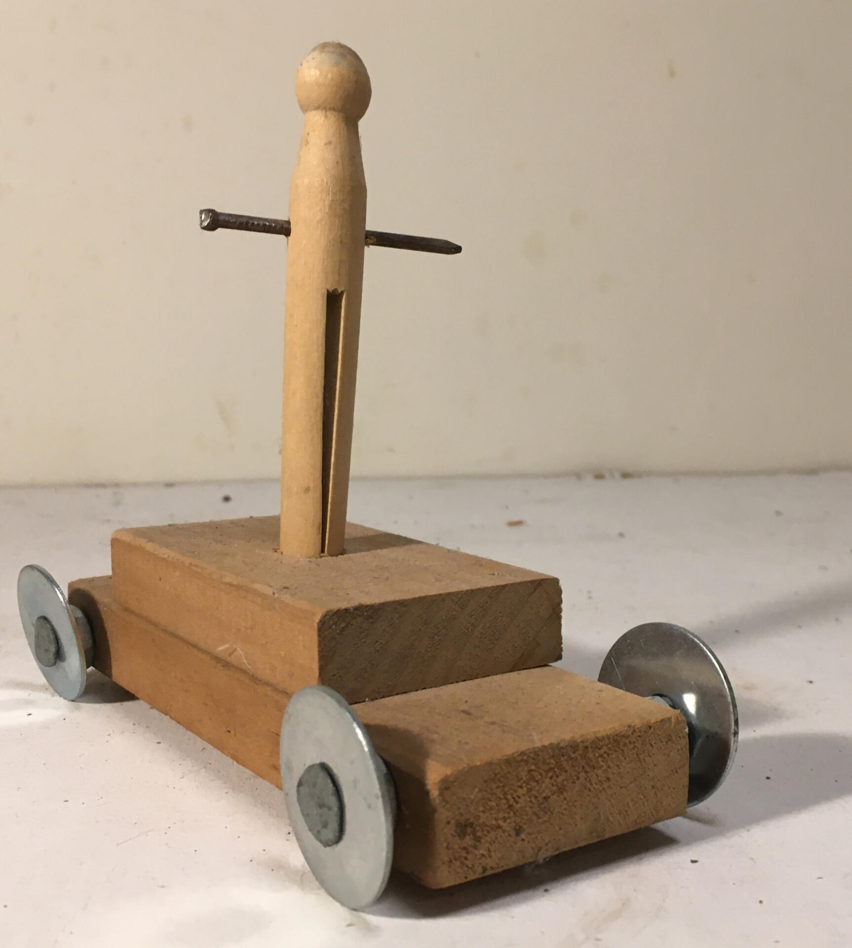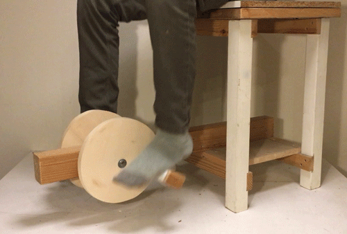 Made of wood and an old stool, this gym machine runs by each wheel fixed to one and other so when one is turned the other does as well. Covering the pedals is a thin plastic tube which rotates freely, allowing the pedal to align with the wheel.